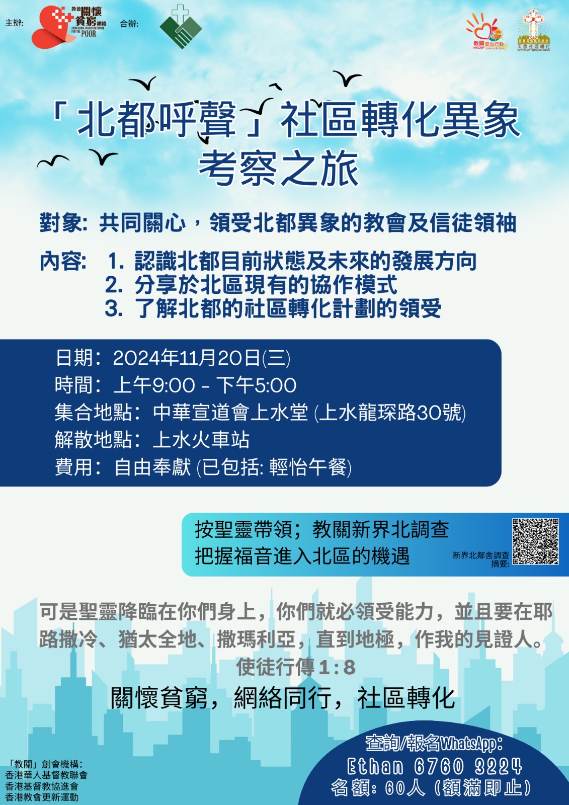 In the 2021 Policy Address, the government pointed out the need to focus on the development of the "Northern Metropolis" covering an area of 300 square kilometers. Once fully developed, the Northern Metropolis is expected to accommodate 2.5 million people, which is about one-third of Hong Kong's current population. In response to the development opportunities in the Northern Metropolis, HKCNP has initiated "Transforming lives in Community, Renovating Churches in North District─ Kingdom Assist Based Community Development Course (KABCD)" in the North District in 2021. We invited Rev Li Hoi Ping, the chairman of the Christian North District Chinese Association, to serve as the convenor of the North District Network, connecting with over 60 churches in the North District to respond to future development needs. We are grateful that HKCNP North District Network has established sustainable and ongoing community transformation initiatives. Below are the latest news and events, and we sincerely invite you to participate: