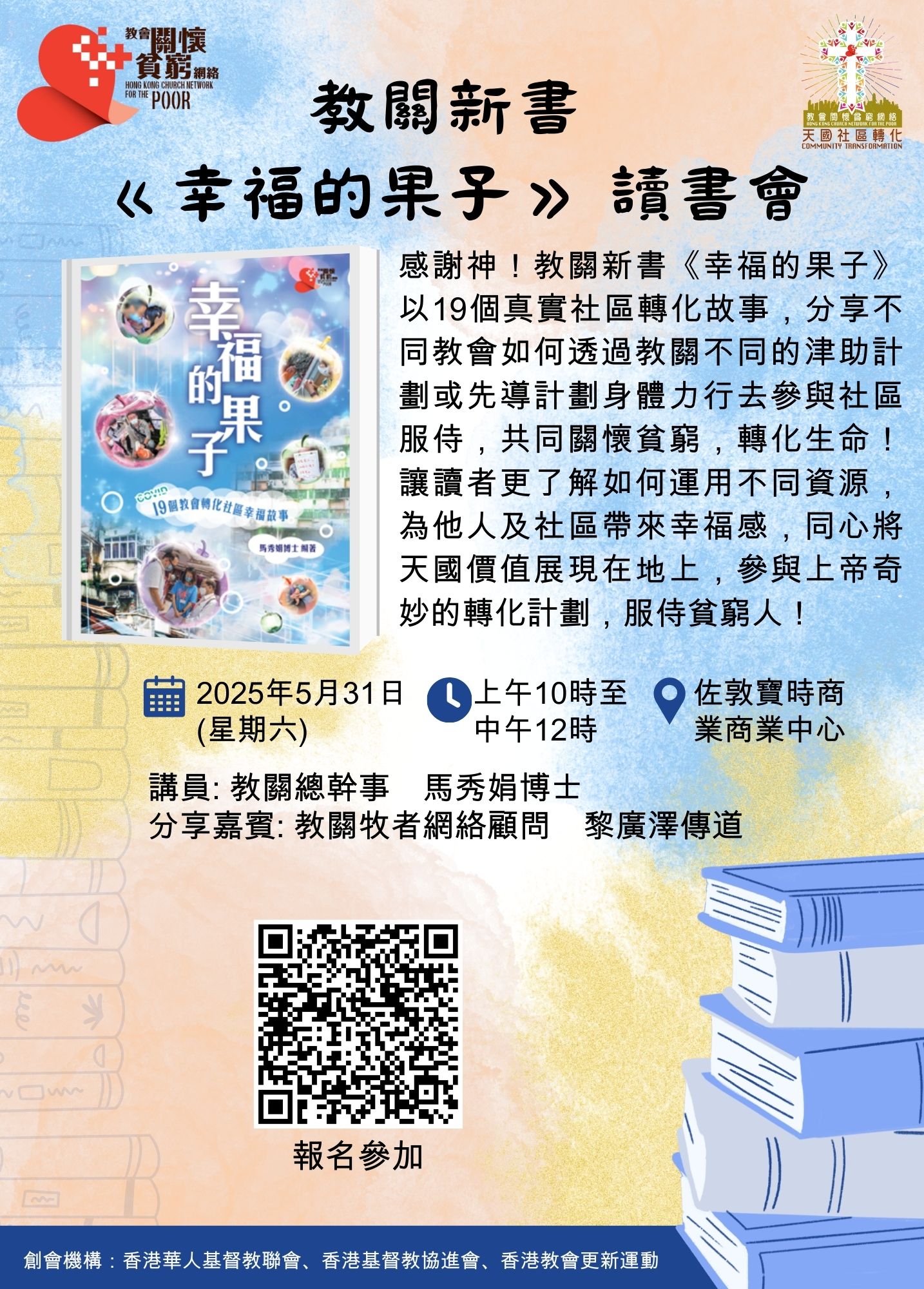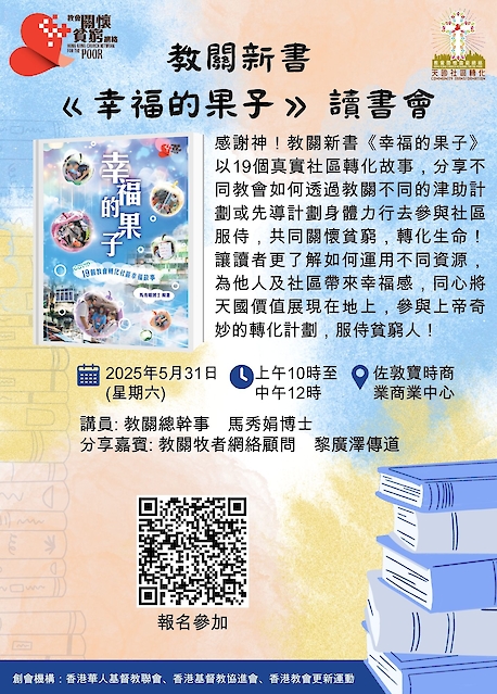 感恩2025年5月31日教關舉行了第二次「幸福的果子讀書會」,透過嘉賓分享「教關社關義工津助計劃」服侍基層青少年及兒童,經歷津助者的生命、教會及社區轉化的故事,與參加者一同被激勵與上主同行,參與轉化社區計劃,回應上主的呼召,服侍基層青少年!誠邀你按此觀看當天的精彩分享影片回顧!